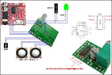 アンプモジュール、Bluetoothレシーバー、LED、電解コンデンサ、USBケーブルを繋ぐだけです。