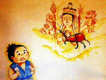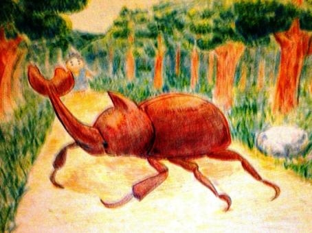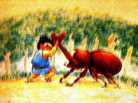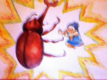 浪右衛門は、泣きたいのをこらえて、おそるおそるカブトムシに近づき、「道のはっしっこでいいので通らせてください。」と言いました。