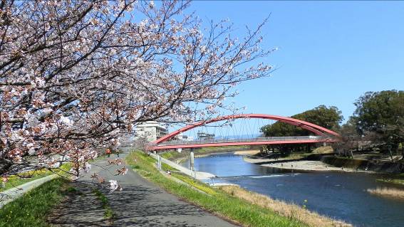 桜のピンク、菜の花の黄色、船小屋温泉大橋の赤色のコントラストが綺麗です。
