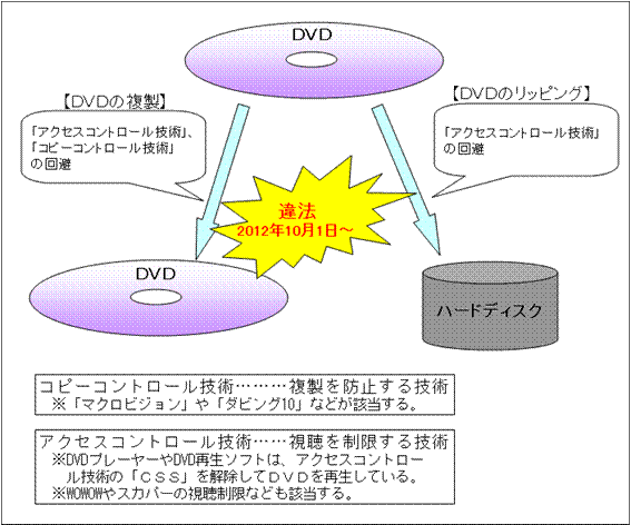 今までも、「マクロビジョン」などのコピーコントロール技術を回避してDVDを複製すると、私的利用であっても違法でした。