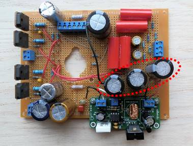少しはみ出して取り付けたことで、スペースに余裕ができたので、ノイズ対策のための電解コンデンサ(315V100uF)を3つ追加しました。
