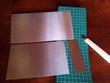 厚さ0.3mmのアルミ板なので、カッターで切れ目を入れて、軽く曲げると簡単に割れます。