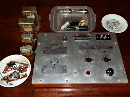 内部です。初めて作成したアンプなので、配線がごちゃごちゃです。。。