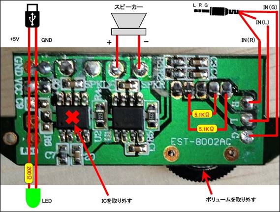 なので、ダイソーのスピーカー(300円)に入っていたデジタルアンプモジュールのIC(8002A)を1つ外しました。