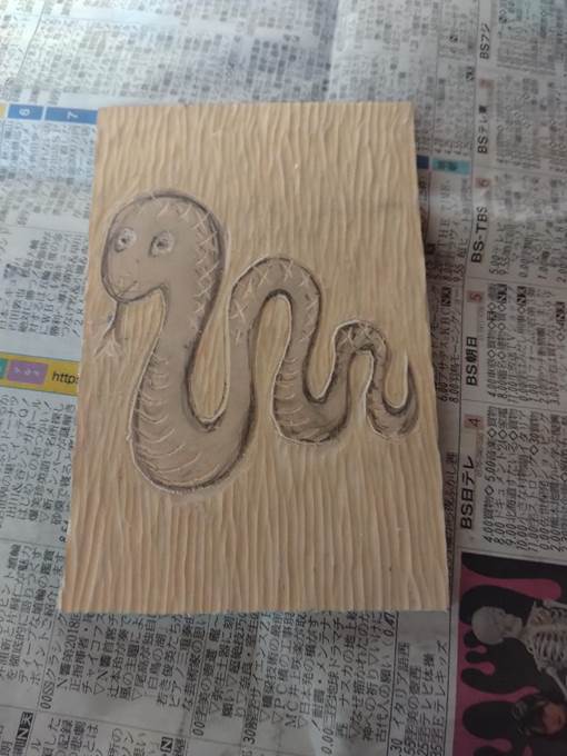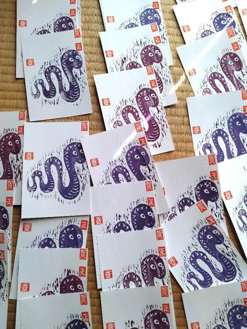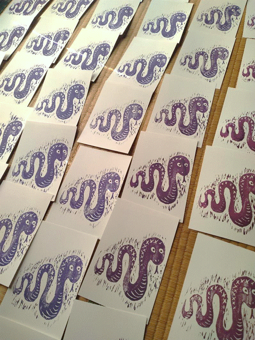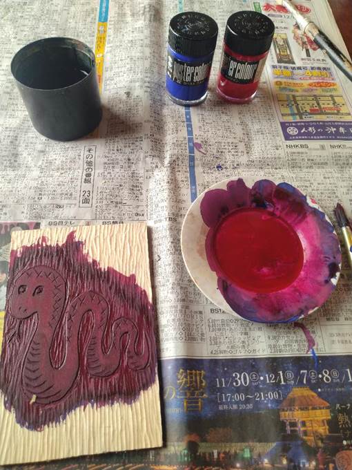 刷りです。赤と青のポスターカラーを混ぜて、紫ですることにしました。