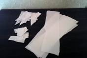 和紙(習字紙でOK)を約3cm〜5cmに手で裂きます。 適当でかまいません。紙は簡単に裂ける方向とそうでない方向があります。 サイズは大、中、小を用意しておきます。 |