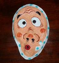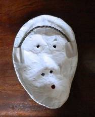 裏面にも水で薄めた木工用ボンドで習字紙を貼ります。 あまり重ねて習字紙を貼ると、お面が軟らかくなって、形が崩れます。 |